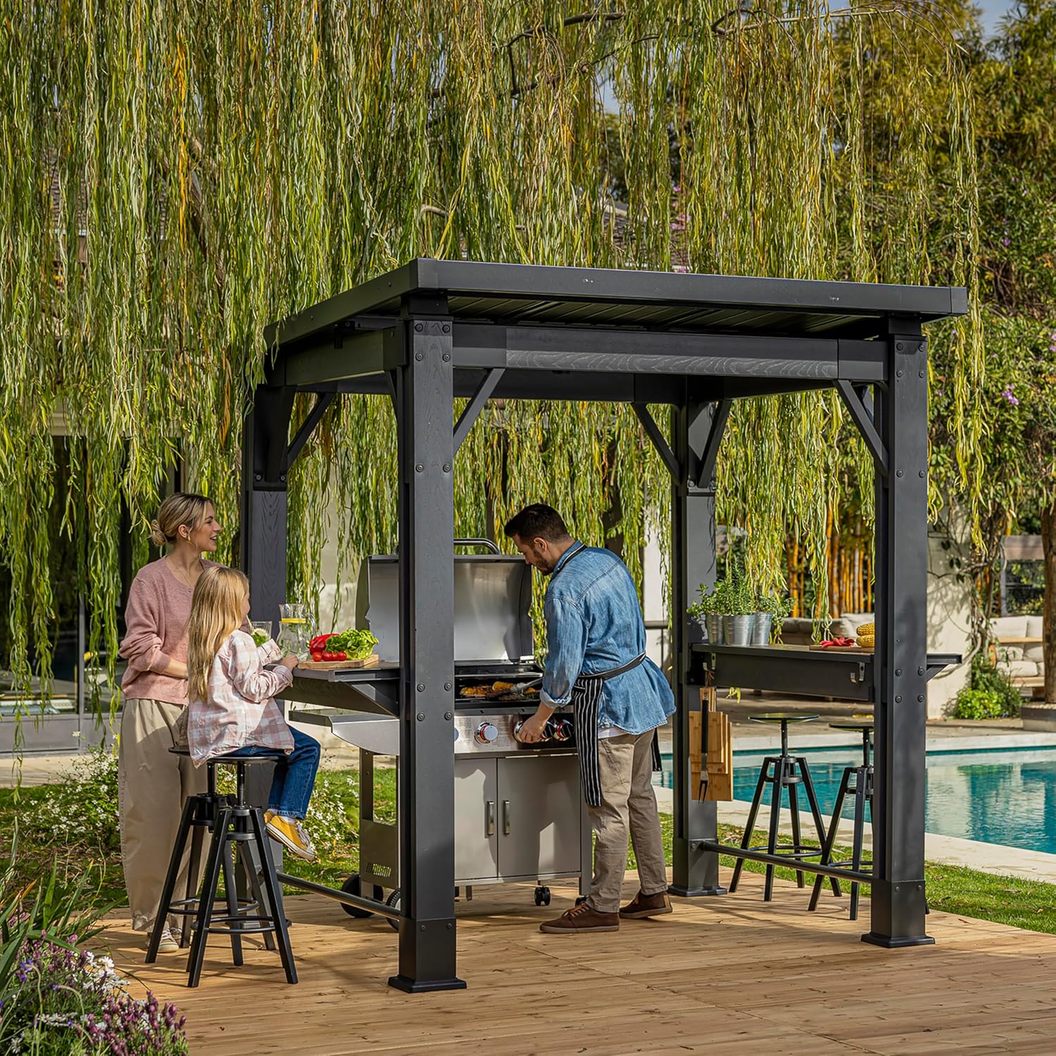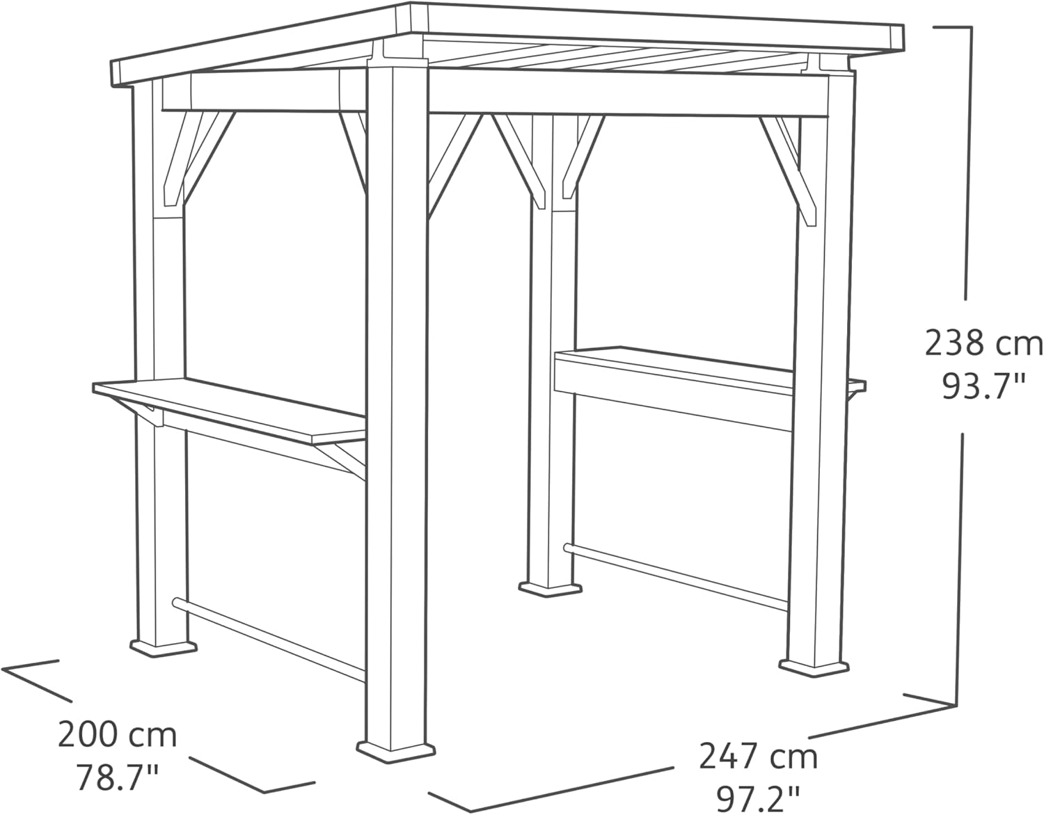 Pérgola Barbacoa Keter gril . Estructura y techo de resina, resistente a la intemperie y sin necesidad de mantenimiento. Bases de anclaje al suelo de metal. Barras laterales con acabado efecto madera. Permite introducir cableado eléctrico a través de la estructura.