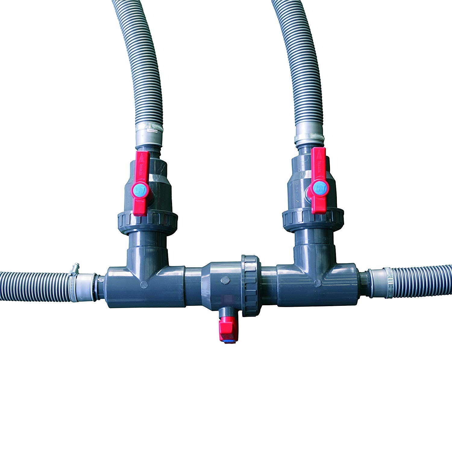 • Completo kit con todos los componentes necesarios para realizar un baipás en el circuito de filtración de tu piscina desmontable para la instalación de una bomba de calor o de un calentador eléctrico.