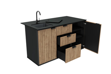 Una cocina exterior elegante y funcional, diseñada pensando en la comodidad y la estética. Equipada con una encimera HPL de alta calidad. El fregadero integrado con grifo opcional ofrece una practicidad total, y su superficie se convierte en una elegante bandeja para servir. Una extensión de encimera opcional te permite crear una isla de cocina: el lugar perfecto para cocinar juntos y disfrutar del aire libre. La sección inferior de la cocina incluye tres cajones con guías metálicas y un armario de dos estantes que ofrece un amplio espacio de almacenamiento. El espacio adicional para un refrigerador convierte a la cocina en una solución completa para preparar comidas al aire libre.