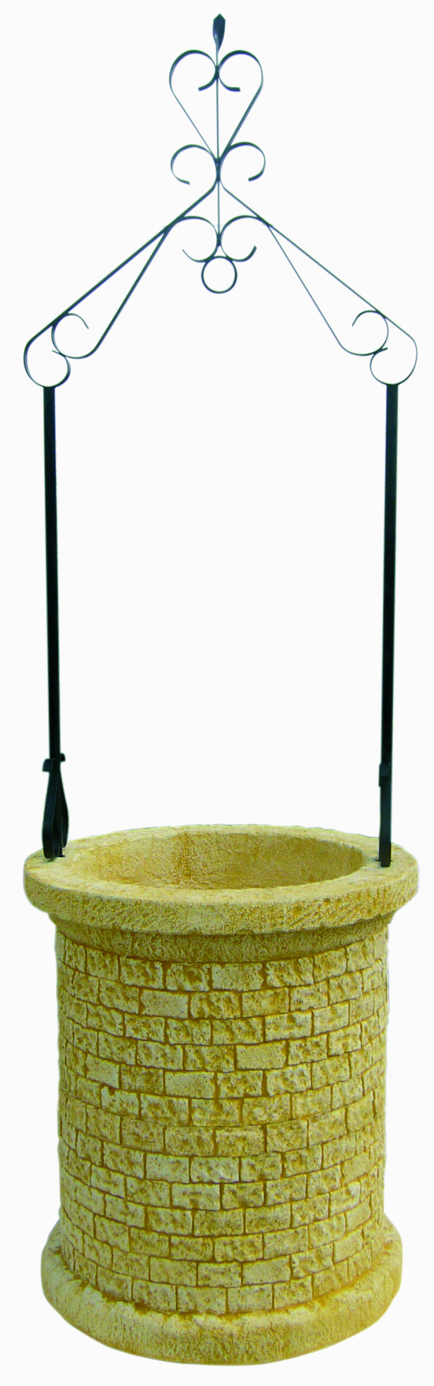 Pozo de jardín fabricado en piedra artificial, resistente a los elementos climáticos, disponible con acabado en pátina ocre, negra y verdoso. Se suministra con arco metálico.